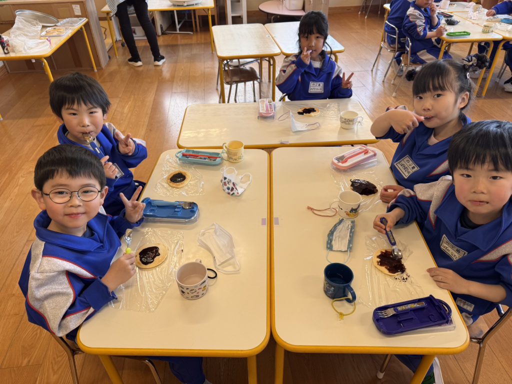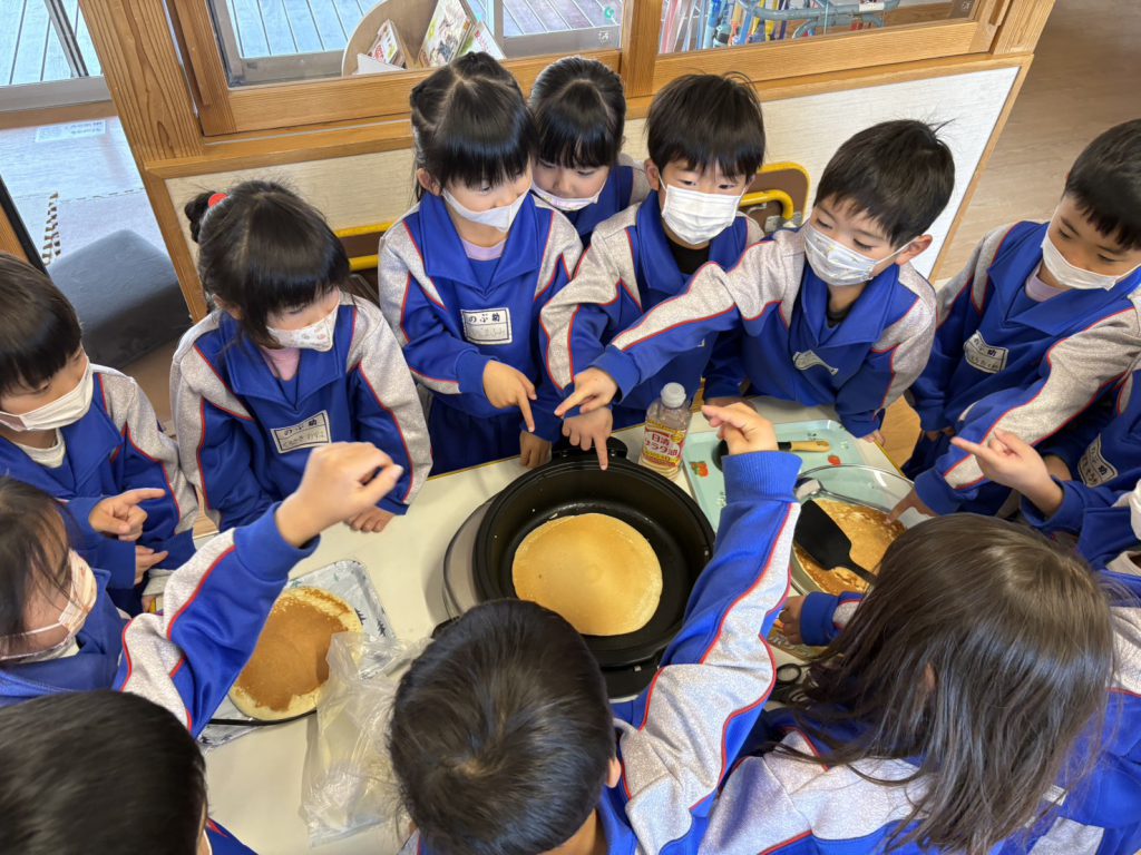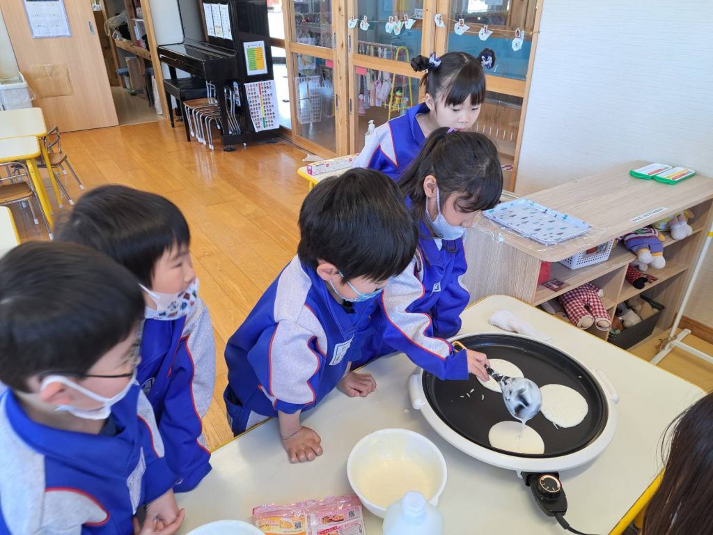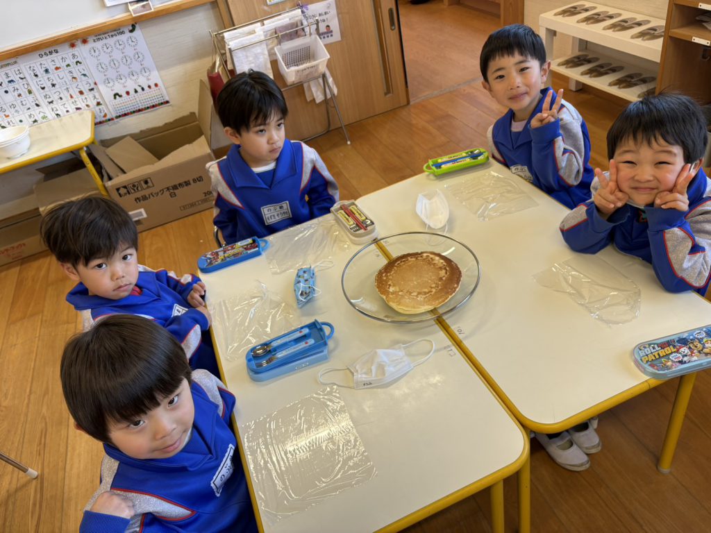グループごとに役割分担をし、みんなで協力して作りました。ひまわり組はグループで一つの大きなホットケーキを作り、「(形が)ピザみたい~!」「これが美味しそう!」と仲良くみんなで切り分けて食べました。ちゅうりっぷ組はグループごとにタネを作り、「まーるくなった!美味しそう!!」と自分の分1枚を作って食べました。お好みでチョコソースをトッピング💕