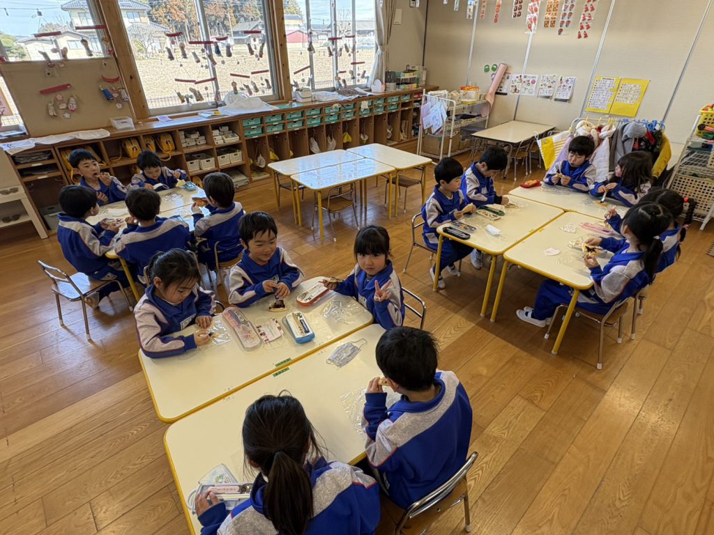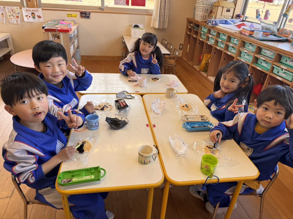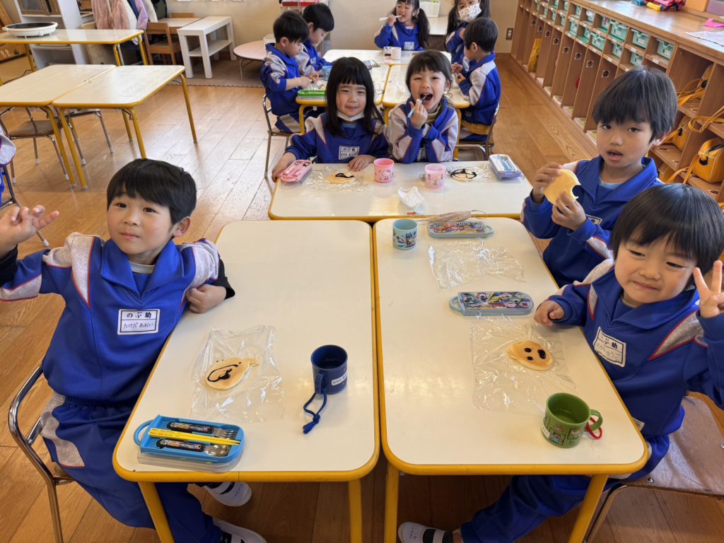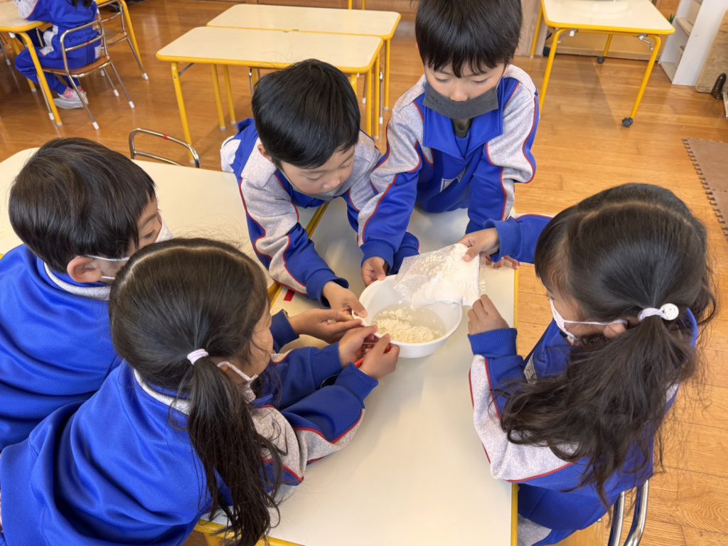 グループごとに役割分担をし、みんなで協力して作りました。ひまわり組はグループで一つの大きなホットケーキを作り、「(形が)ピザみたい~!」「これが美味しそう!」と仲良くみんなで切り分けて食べました。ちゅうりっぷ組はグループごとにタネを作り、「まーるくなった!美味しそう!!」と自分の分1枚を作って食べました。お好みでチョコソースをトッピング💕