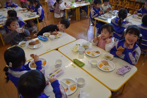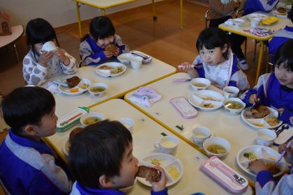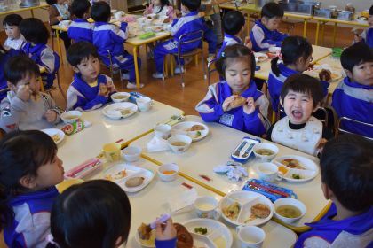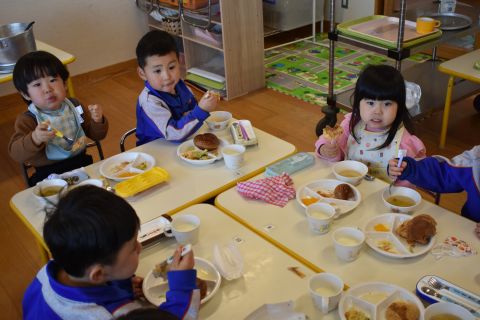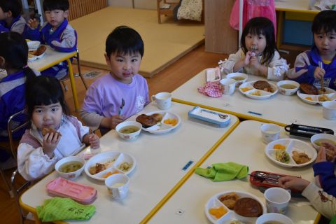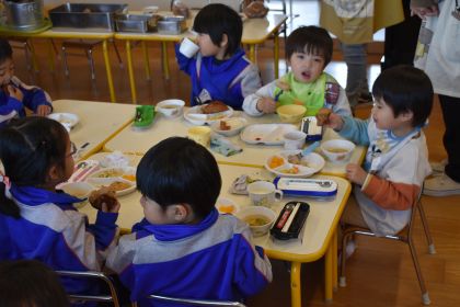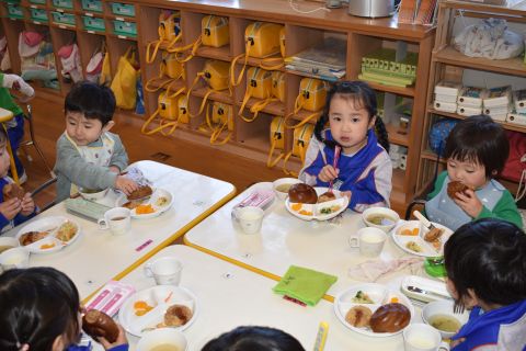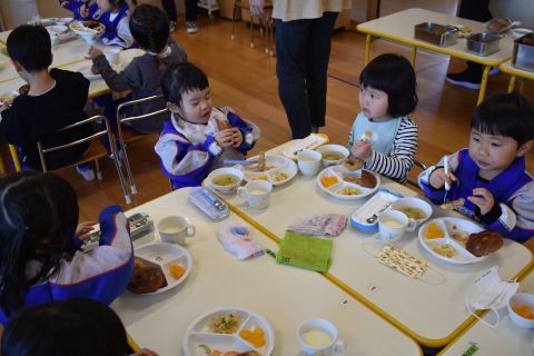 3月5日(木)、まもなく年少組に進級する2歳児たんぽぽ組さんが、年少組のお部屋に行って給食交流してきました♪