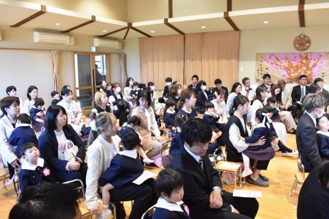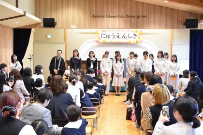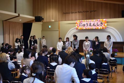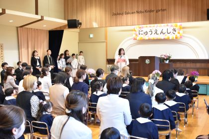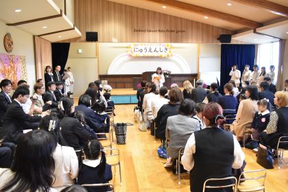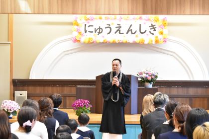 乳児組からの進級児と新しく幼児組に入園した子ども達が、真新しい制服で参加し、担任の先生から名前を呼んでもらったり、記念撮影をしたり・・・。